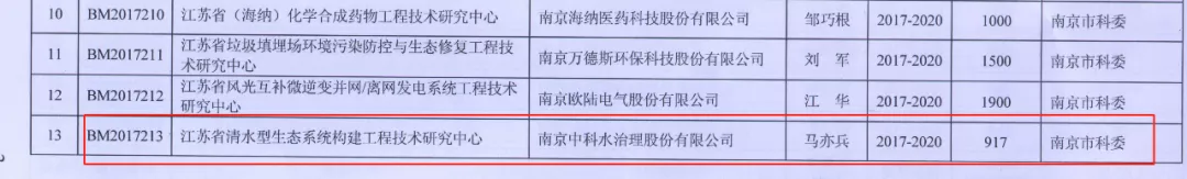 2017年11月,江蘇省科學技術廳將“江蘇省工程技術研究中心”建設項目下達給222家單位,南京中科水治理股份有限公司承擔“江蘇省清水型生態系統構建工程技術研究中心”建設工作。